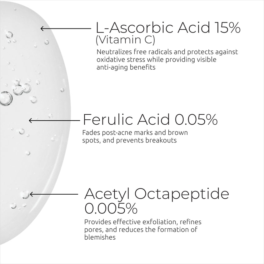 Aqua, Ascorbic Acid, Propanediol, Isopropyl Alcohol, Ethoxydiglycol, Glycerin, Dimethyl Isosorbide, Dimethicone, Laureth-4, Laureth-23, Ethylhexylglycerin, Phenoxyethanol, Ferulic Acid, Acetyl Hexapeptide-3, Xanthan Gum